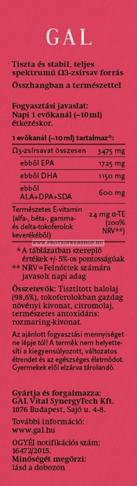 Nem átalakított, természetes formában tartalmazza az ember számára megfelelő EPA és DHA nevű Ω3 zsírsavakat és 4 féle tokoferolt (E-vitamin) is, hogy a lehető legstabilabb legyen. Enyhe hal íze van csak, amit szinte teljesen elfed a citromolaj, így nem kell többé tucatnyi kapszulát lenyelnünk. 1 evőkanálnyi kb. 15 db halolaj-kapszulának felel meg!